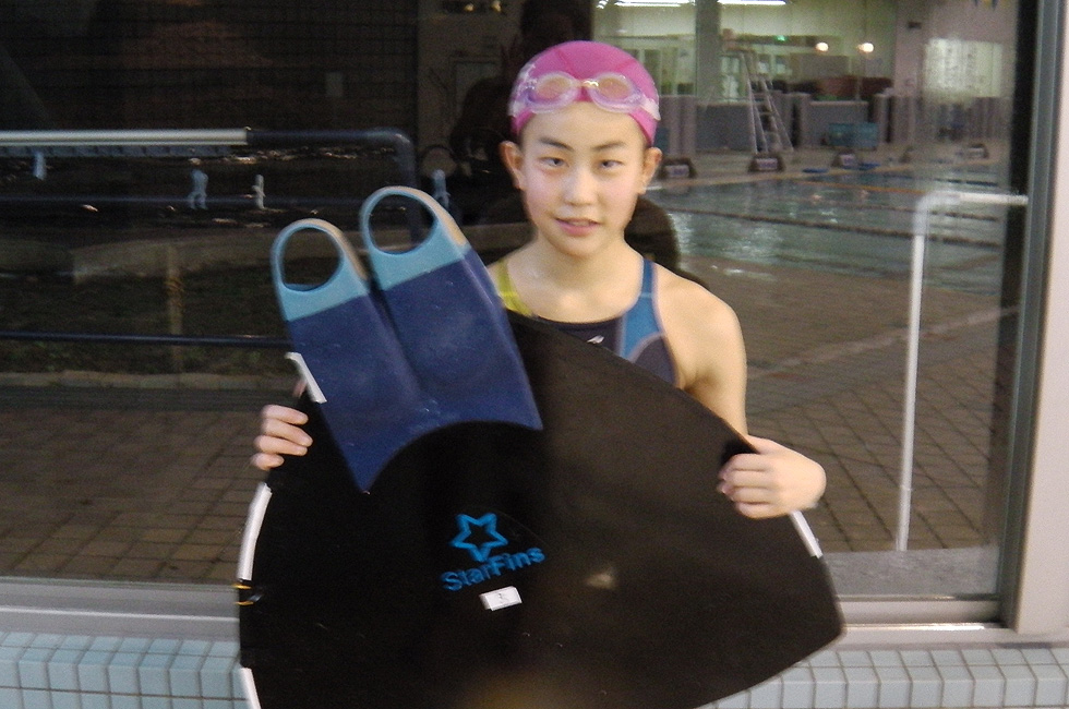 一回のキックでたくさん進むところとても好きです。始めたきっかけは、いつも水泳を教えてくれてるコーチにフィンスイミングの練習現場に連れて行ってもらった時に自分もやってみたいと思い、コーチに「やってみるか?」と言われたことです。最近は水泳のタイムが伸び悩んでいましたが、フィンスイミングに出会ったことで水泳に対するモチベーションもあらためて向上しました。タイムも良くなってきました。