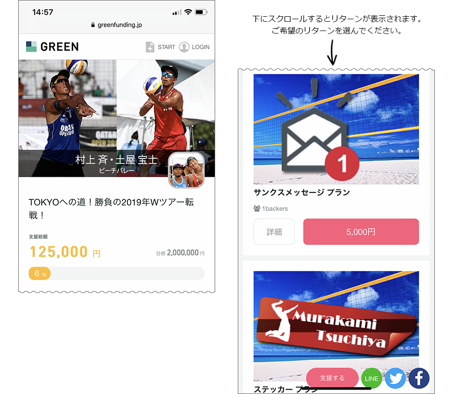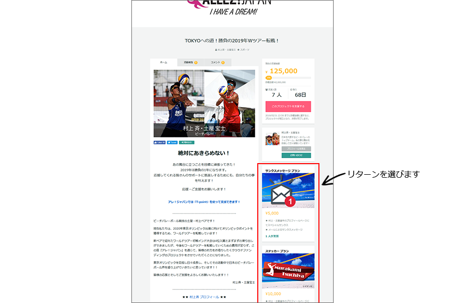 アスリートのクラウドファンディングプロジェクトをサポート(支援)すると、アスリートからのお礼の言葉と共にリターンを得ることができます。それは、サイン入りのTシャツだったり、プライベートレッスン受講権だったり、アスリートが使用した競技道具だったり。